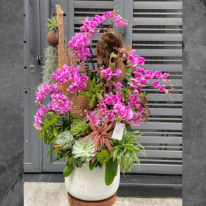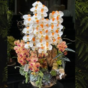 Hoa Mừng Khai Trương Đẹp – Kệ Hoa Sen Đá Ghép Gỗ Lũa Cùng Lan Hồ Điệp Tím Hồng