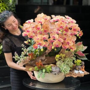 Lan Hồ Điệp Chậu Màu Cam Gạch Ghép Gỗ Lũa Sang Trọng