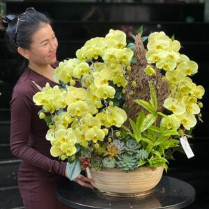 Lan Hồ Điệp Vàng Bơ Ghép Gỗ Lũa Mix Sen Đá – Chậu Hồ Điệp Xanh Bơ Sang Trọng