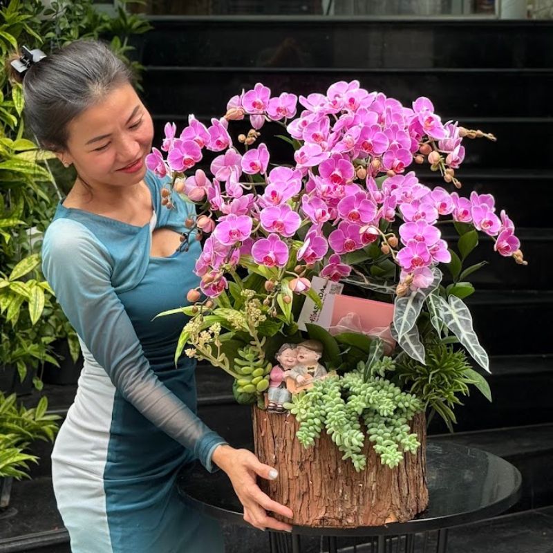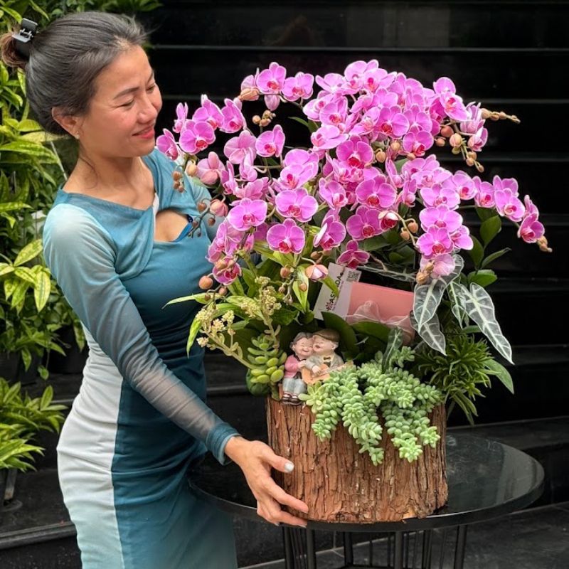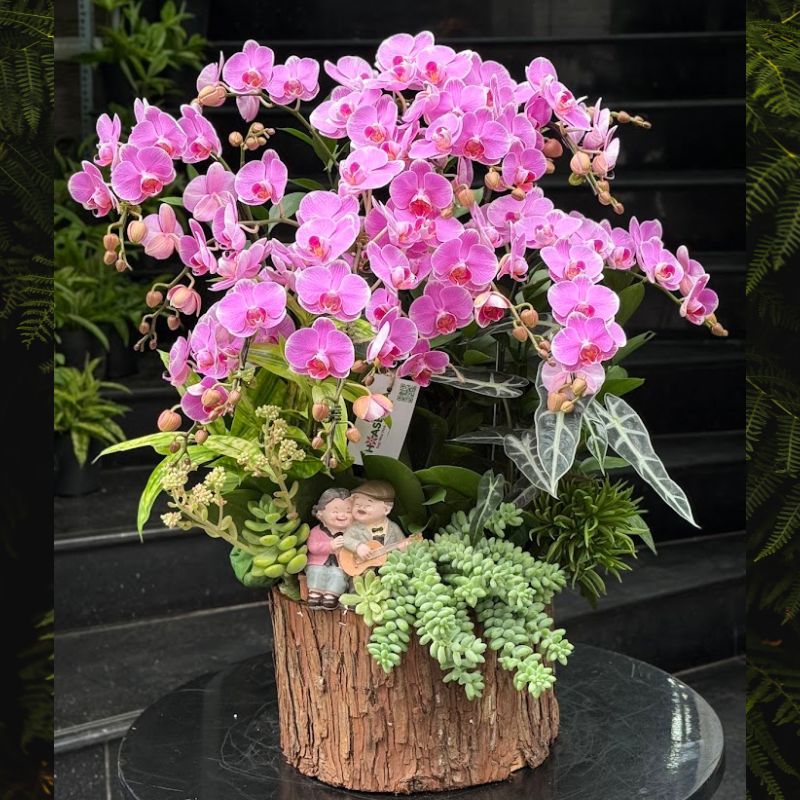 Hoa 8 3 Tặng Mẹ, lẵng hoa lan hồ điệp hồng trồng cùng sen đá mix tượng ông bà hạnh phúc